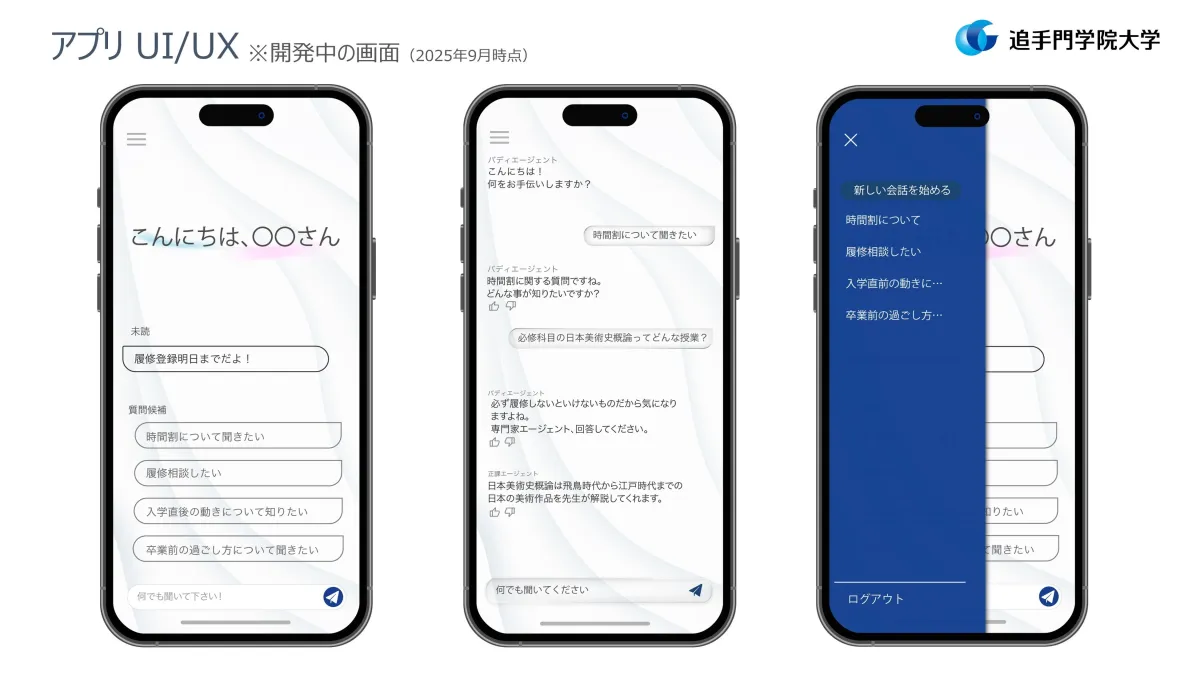 このAIアドバイザー機能は、日本で初めて大学独自のアプリにマルチエージェント構成を取り入れたもので、統合データベースに蓄積された個々の学修データや行動履歴、就職活動に関する情報を活用します。学生がアプリに登録した情報や興味関心を基に、履修や資格取得、留学、就職さらには課外活動に至るまで幅広い相談に特化したアドバイスを行います。