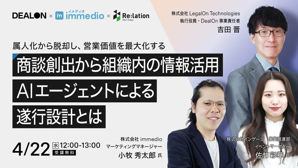 2026年4月22日(水)、大阪を拠点とする株式会社インゲージが、株式会社immedioと株式会社LegalOn Technologiesと共同で、営業生産性の向上に向けた無料ウェビナーを開催します。このウェビナーでは、特にBtoBビジネスにおける営業プロセスの効率化と属人化解消に焦点を当て、具体的な実践方法を探ります。