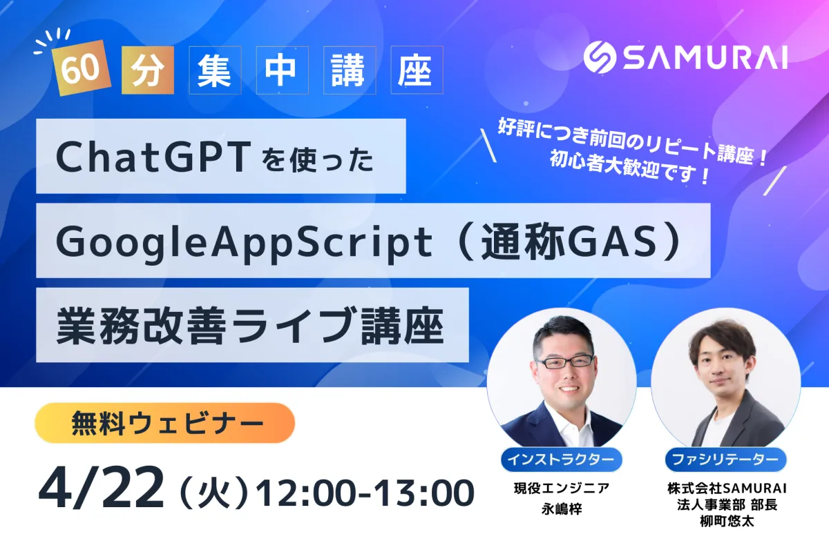 2025年4月22日、株式会社SAMURAIが提供する『ChatGPTを使ったGoogleAppScript(通称GAS)業務改善ライブ講座』が無料で開催される。この講座は、現役エンジニアによるライブコーディング形式で、プログラミング未経験者でも自信を持って参加できる内容となっている。