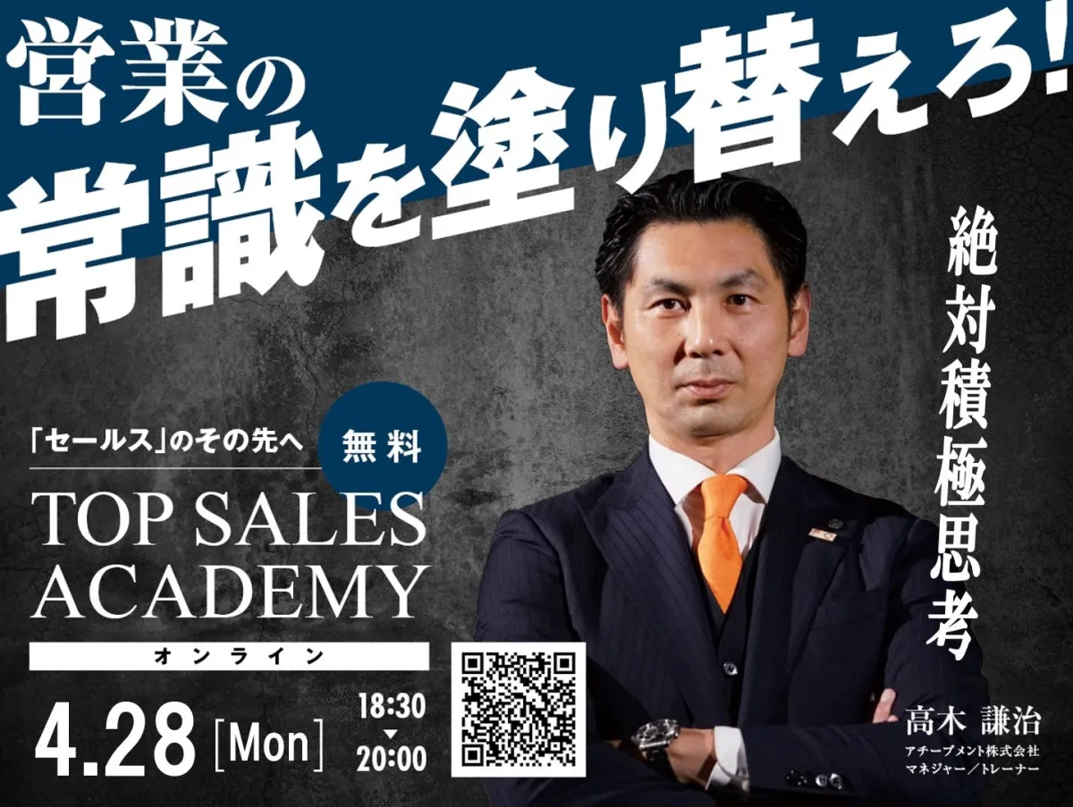 2025年4月28日、アチーブメント株式会社が主催した営業職向けセミナー「TOP SALES ACADEMY」が盛況に開催されました。このセミナーでは、成績を上げるために必要なマインドや技術について、マネジャー兼トレーナーの高木謙治がその経験を基に参加者に語りかけました。