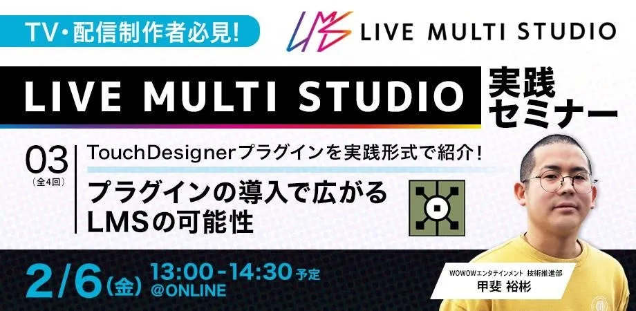 このセミナーは、特にライブ映像制作に携わる方々にとって必見の内容です。登壇者は、WOWOWエンタテインメントから甲斐裕彬氏。彼はTouchDesignerを使用した映像システムの開発経験を活かし、具体的な事例を交えながら、LMSのさらなる可能性を実践形式で紹介します。