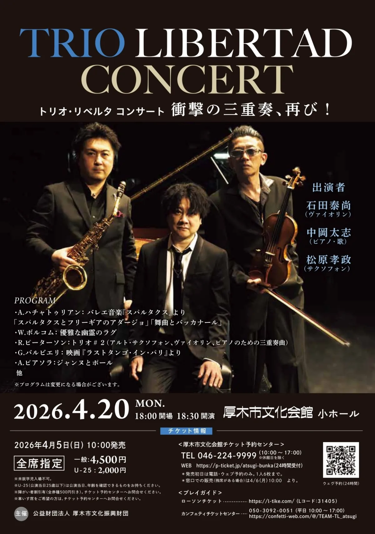 『トリオ・リベルタ コンサート』は、厚木市文化会館の小ホールで行われ、18:30に開演します。会場は神奈川県厚木市恩名1丁目9-20に位置しています。この特別なコンサートのチケットは、2026年4月5日(日)10:00からカンフェティにて発売開始され、一般は4,500円、U-25は2,000円で全席指定となっています。