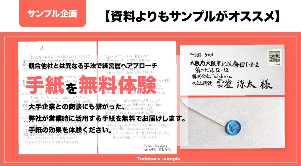 この機会に、Todokeruの無料手紙サンプルをお試ししてみてはいかがでしょうか?生の手紙による営業の魅力を、実際に感じることができる貴重なチャンスです。サンプルを通じて手紙営業の効果を確かめることで、あなたのビジネスにも新たな光が差し込むかもしれません。