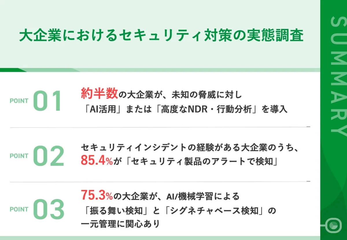 大企業におけるセキュリティ対策に関するこの調査から、サイバー攻撃のリスクは現実のものであり、企業が直面する課題も明白であることがうかがえます。今後、企業は未知の脅威へより効果的に対策できる歩みを進めることが求められています。更なる詳細な調査結果は、以下のリンクからダウンロード可能です。