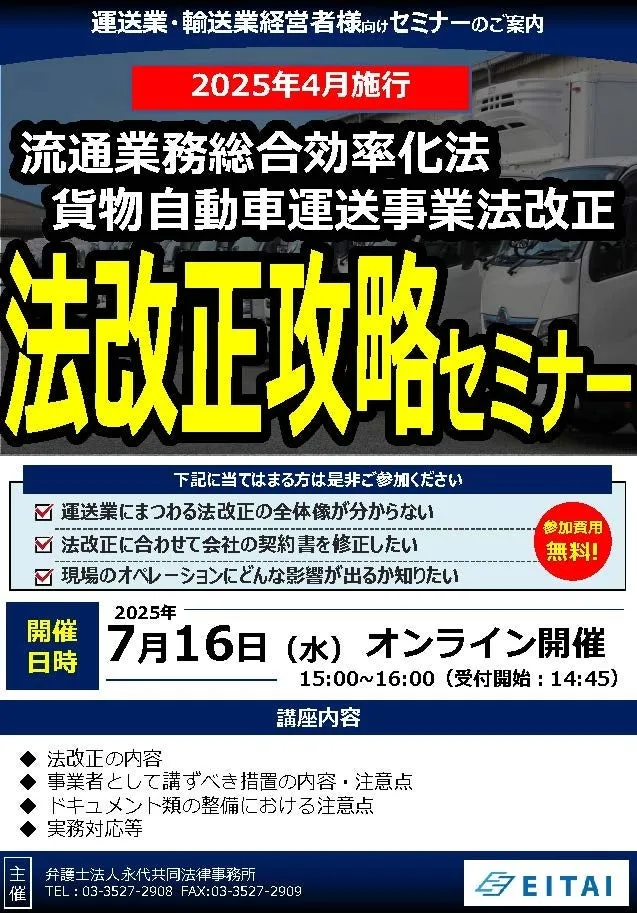 本セミナーの目玉は、運送業に精通した弁護士が講師を務めることです。実務に即した具体的な解説を通じて、参加者は法改正に関する理解を深め、今後の業務運営における法的リスクを適切に管理するための知識を得ることができます。