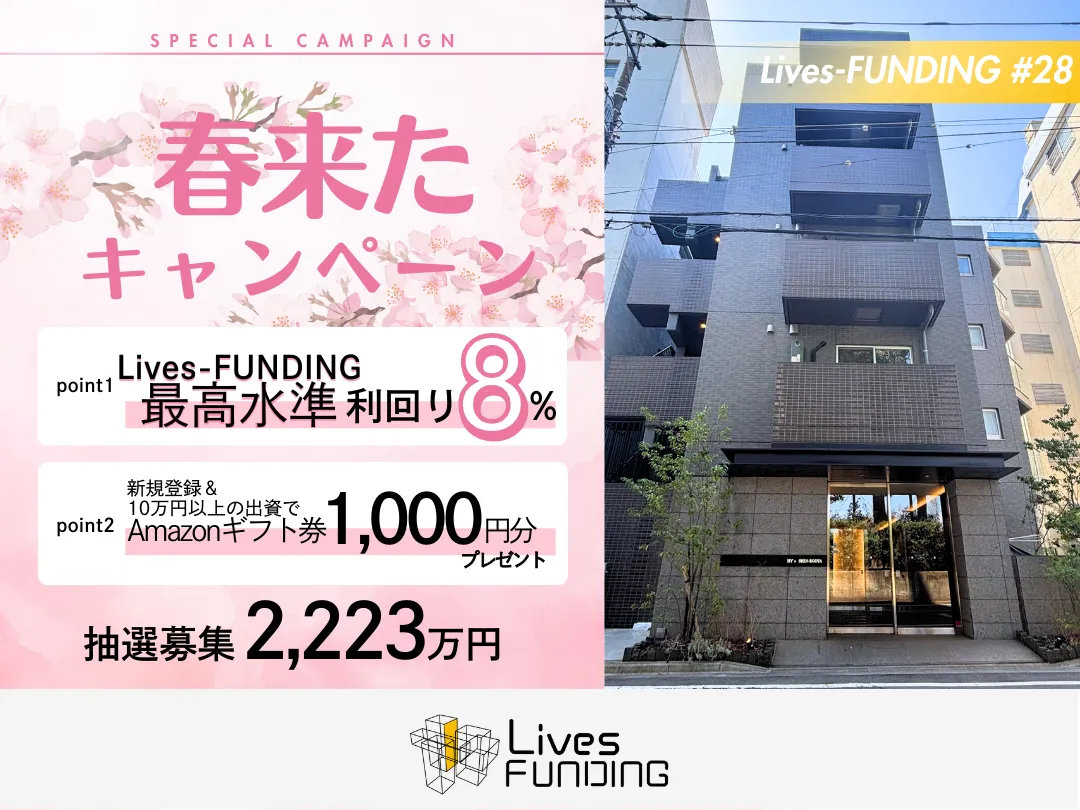 不動産クラウドファンディング「Lives-FUNDING」を展開する株式会社ライブズは、最高水準の利回り8.00%を実現するファンドの募集を開始しました。2025年5月8日まで募集されるこのファンドは、春の特別キャンペーン「春来たキャンペーン」として、新規登録と10万円以上の出資を行うことで、Amazonギフト券1,000円をプレゼントするという嬉しいオファーが付いています。