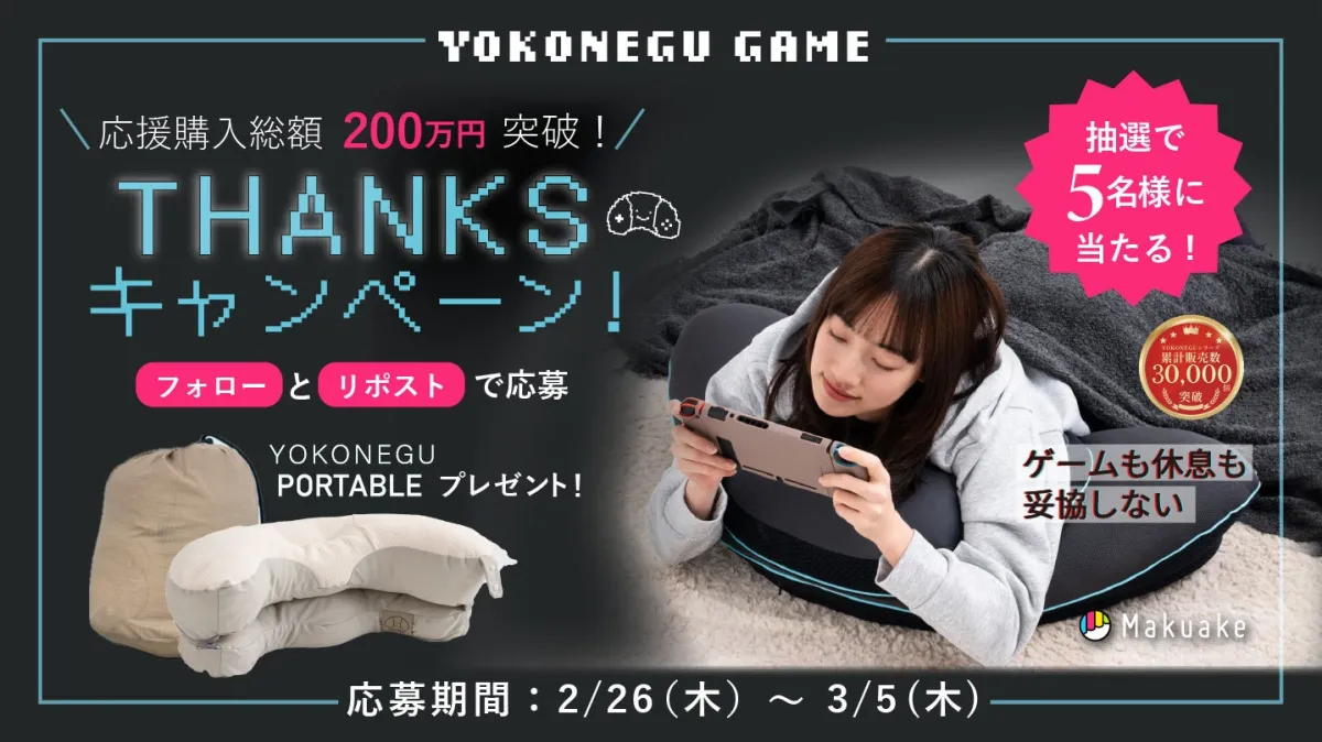 富士ベッド工業株式会社が展開しているゲーミング枕「YOKONEGU GAME」が、応援購入サービス「Makuake」にて、総額200万円突破を記念してSNSプレゼントキャンペーンを開催しています。このキャンペーンは、人気シリーズ「YOKONEGU」のコンパクトモデル「YOKONEGU Portable」を抽選で合計10名様にプレゼントするというものです。