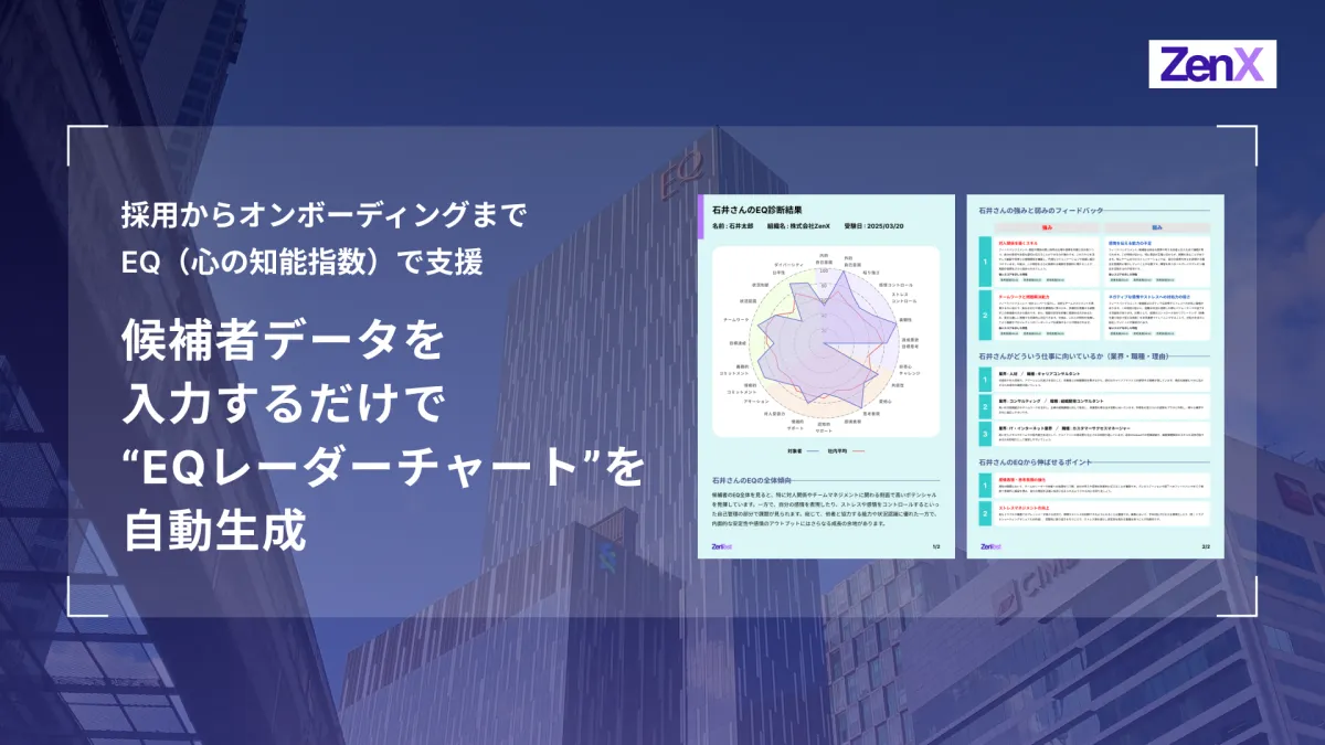 株式会社ZenXが展開する採用支援プラットフォーム「ZenTest」は、これまでのEQ(心の知能指数)診断を一新し、生成AIとビジュアライゼーション技術を活用した新機能を発表しました。候補者の基本情報をフォームに入力するだけで、わずか数十秒で高精度なレーダーチャートが生成され、その背後には詳細な解析レポートが付随します。この仕組みにより、採用担当者は短い面談時間であっても候補者と効果的に対話し、候補者自身も自己理解を深めることができるようになります。