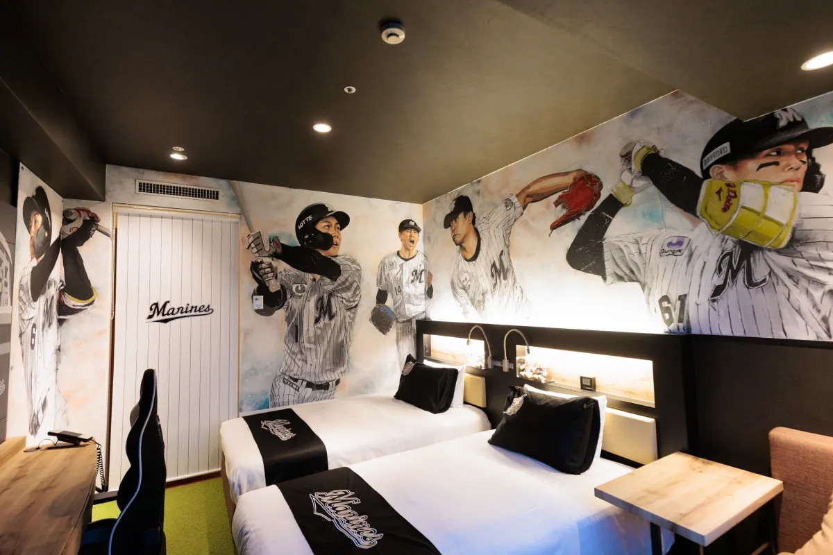 リニューアルされた「マリーンズルーム」は、プロ野球チームの特色を活かしたデザインとなっています。壁面には、壁画アーティストHori Hayato氏が手掛けた5人の選手が描かれており、まるで試合の迫力をそのまま感じられるような仕上がりです。具体的には、小島和哉投手、種市篤暉投手、藤原恭大選手、西川史礁選手、山本大斗選手の姿が壁画に込められています。これらの選手たちが躍動する様子が描かれたこのルームは、ただの宿泊施設ではなく、ファンにとっての特別な空間となることでしょう。