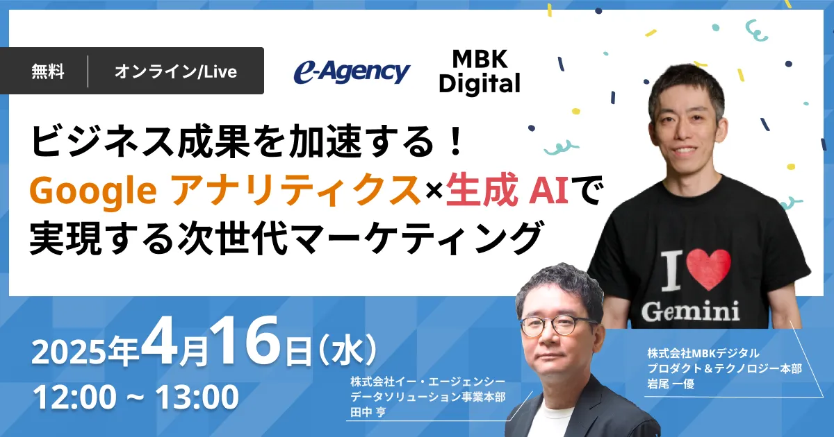 株式会社イー・エージェンシーは、2025年4月16日(水)に、株式会社MBKデジタルと共催で「ビジネス成果を加速する!Google アナリティクス×生成 AI で実現する次世代マーケティング」セミナーを開催します。このオンラインセミナーでは、Googleアナリティクスと生成AIツールを活用したマーケティング手法を深く掘り下げた内容が提供されます。