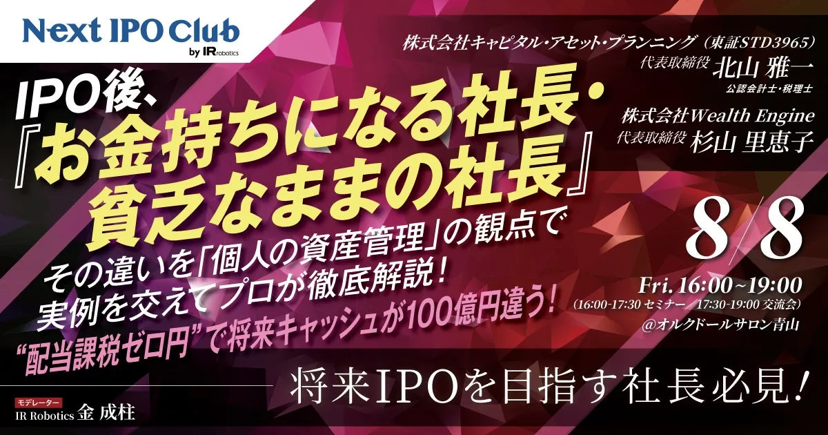 IPO(新規株式公開)を目指す社長向けのオープンセミナーが開催されます。今回は、株式会社キャピタル・アセット・プランニングの北山社長と、株式会社Wealth Engineの杉山社長が講師を務め、成功するための秘訣を実例を交えてお話しします。このセミナーは、将来IPOを目指す経営者にとって、貴重な情報とネットワーキングの場となるでしょう。