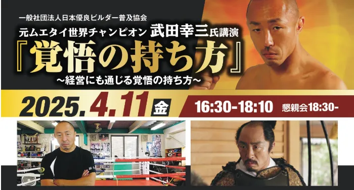 2025年4月11日金曜日、元ムエタイ世界チャンピオンである武田幸三氏の講演『覚悟の持ち方』が開催されることが決定しました。