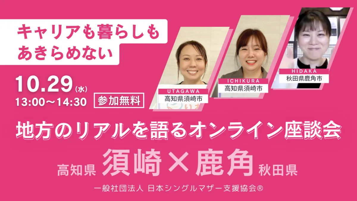 2025年10月29日、水曜日に一般社団法人日本シングルマザー支援協会が主催する「キャリアも暮らしもあきらめない。地方のリアルを語るオンライン座談会【須崎×鹿角】」が開催されます。このイベントは、高知県須崎市と秋田県鹿角市をオンラインでつなぎ、地方で生活し、働く女性たちの声をリアルにお届けするものです。参加者は、地方に移住したい、または新たな働き方に興味がある方々に向けて、実際の経験やヒントを共有する機会です。