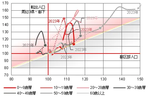 また、50~59歳層に関しては転出が増加していますが、これは人口全体の増加に近い動きです。これにより、特定の年齢層が東京都からどの地域へ移動するのか、今後のトレンドを見据えた分析が重要です。