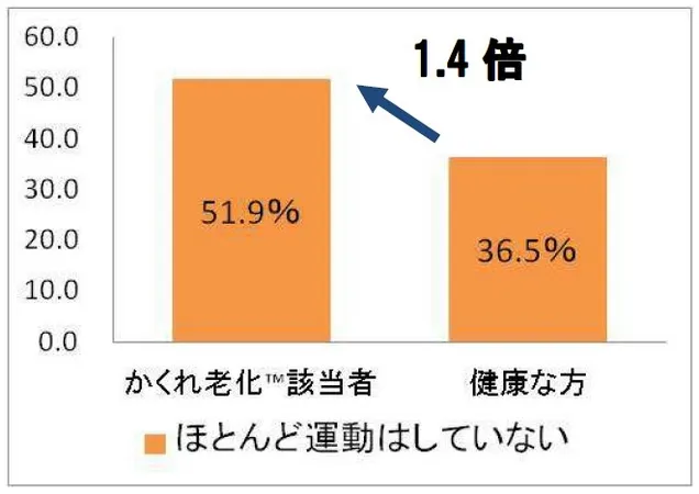 40~50代の男女1000名(「かくれ老化™」該当者767名、健康な方233名)を対象としたインターネット調査によると、「ほとんど運動をしていない」と回答した人の割合は、「かくれ老化™」該当者で51.9%、健康な人で36.5%という結果に。運動不足は「かくれ老化™」のリスクを1.4倍も高めるという、衝撃的な事実が明らかになりました。