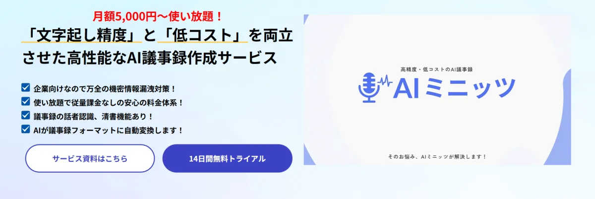 「AIミニッツ」は、主に企業向けに設計されたAI議事録サービスです。特徴の一つは、セキュリティの強化で、企業にとって重要な会議情報が漏洩しないように、多層的なデータ保護が施されています。具体的には、