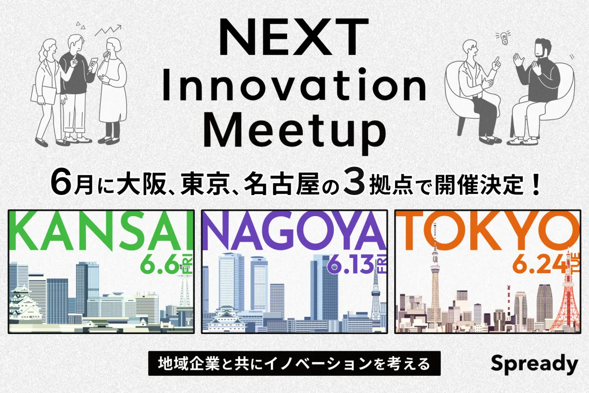 Spready株式会社が主催する「NEXT Innovation Meetup」は、2025年6月に東京、名古屋、大阪で開催される新規事業開発に関心のある方々のための交流イベントです。このイベントは、同じ課題を抱える企業担当者が集まり、お互いの知見を交換し、イノベーションを創出するための貴重な機会です。