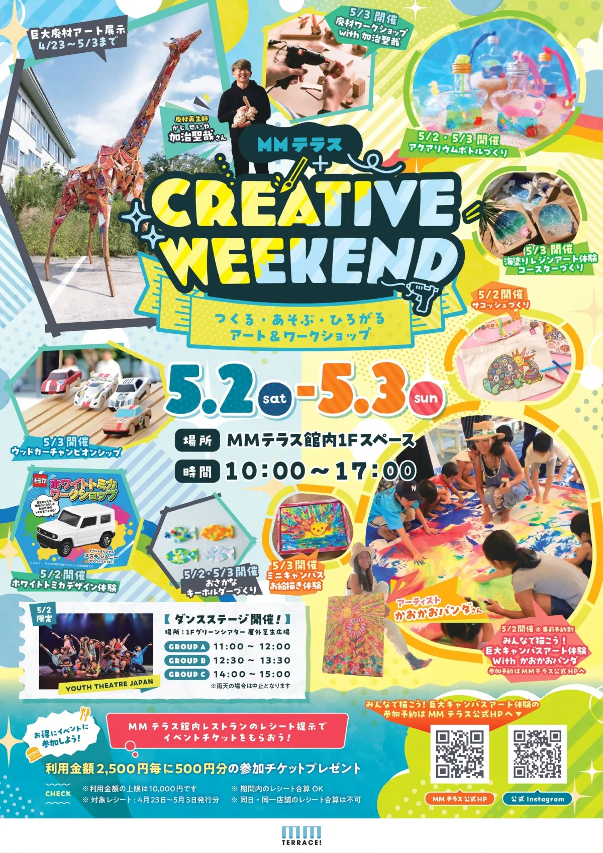 イベント期間中には、参加者が気軽に楽しめる内容が豊富です。例えば、5月2日には「みんなで描こう!巨大キャンバスアート体験」が実施され、カオリウィンドウ氏とともに自由に絵を描く楽しみを味わえます。この体験では、参加者が描いた作品がMMテラス館内に展示され、完成した作品を見られるという特別な思い出になります。