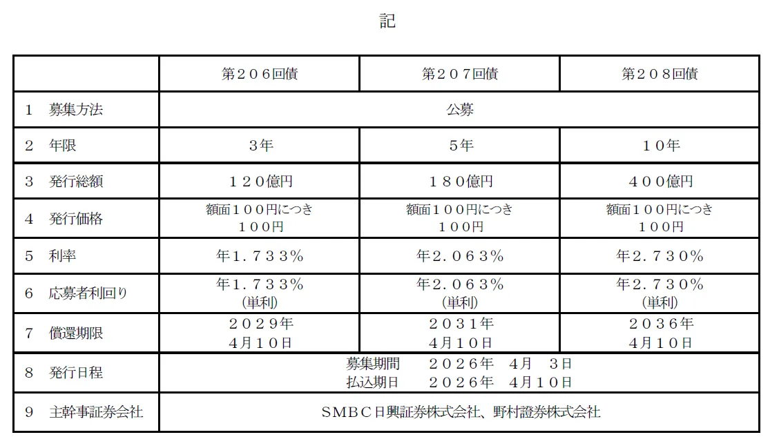 発行される社債には、3年債、5年債、10年債の3種類があり、それぞれ異なる金額が設定されています。特に10年債は400億円と大きな金額であり、長期的な資金調達としても注目されています。これらの社債は、特に企業の財務健全性を高めるための重要な手段です。