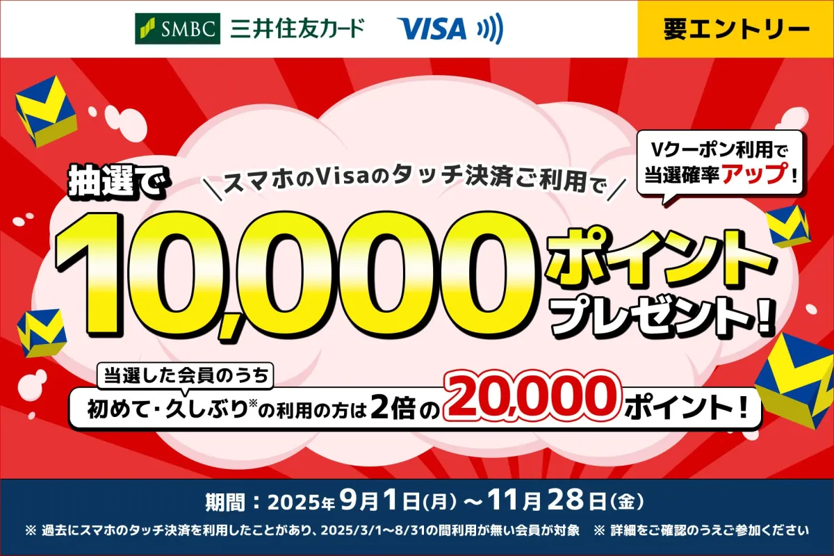 三井住友カード株式会社は、2025年9月1日から11月28日までの期間中、対象カードを利用したスマホのVisaタッチ決済で抽選に参加できる新しいキャンペーンを展開することを発表しました。このキャンペーンでは、キャンペーン期間中にスマホのタッチ決済を利用すると、最大20,000ポイントが当たるチャンスがあります。