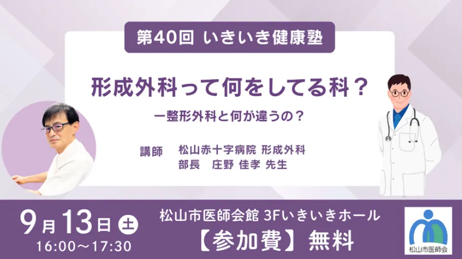 日本では、あまり理解が進んでいない形成外科と整形外科の違いや、「皮膚がん」に関する正しい知識を普及することを目的としており、今回の講師は松山赤十字病院の形成外科部長・庄野佳孝先生です。未知の部分が多い「皮膚がん」についても深く理解できる内容となっています。多くの人が「名前は知っているが、具体的にどのようなものか分からない」と感じていることでしょう。この機会に、専門医から直接学ぶことで、日常生活に役立つ知識を身につけましょう。
