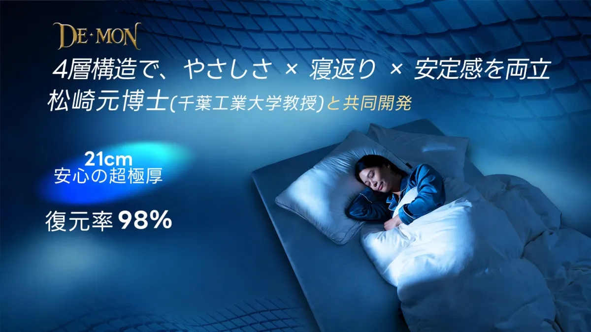睡眠は単なる休息の手段ではなく、生活の質や翌日の生産性に大きな影響を与える要因となっています。このような分析から、DE・MONは快適な睡眠を促進するマットレスを開発しました。過剰な機能はなく、必要な部分だけを高める設計が施されています。特に、体圧分散や寝返りのしやすさ、振動吸収性と通気性のバランスを意識した設計がされています。