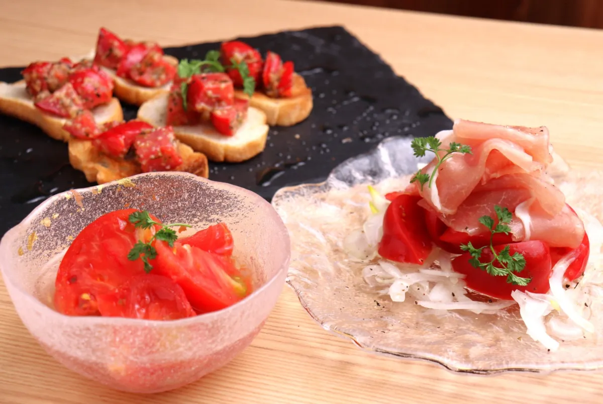 「フルーツトマトと生ハムのサラダ」も見逃せません。生ハムの塩味がトマトの甘さを引き立て、一口ごとに飽きが来ません。さらに、軽やかなアプローチを求める方には「フルーツトマトのブルスケッタ」がぴったり。香ばしく焼いたパンに新鮮なトマトを乗せた一品は、食事の始まりにふさわしい軽快さを提供します。