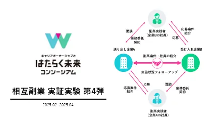2025年1月から4月にかけて、「キャリアオーナーシップとはたらく未来コンソーシアム」が主催する相互副業実証実験が行われる。この取り組みは、企業や組織の成長を促す新しいモデルを模索しているもので、全国から48の企業と団体が参加している。この実験の主な目的は、個人が持つスキルを最大限に引き出し、ビジネス成長に資する業務提携を想定した「副業」(いわば異業種間の仕事の橋渡し)を通じて、実際にどのような効果が生じるかを評価することだ。