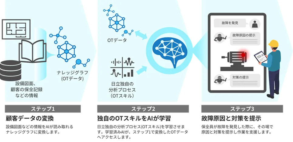 このソリューションの運用メカニズムは、顧客が蓄積してきた各種設備の図面をナレッジグラフに変換し、それを生成AIが解析します。さらに、保全記録などのデータと、設備故障原因分析プロセスである「OTスキル」を学習させることで、一般的な保全技術者の知識と同等以上の故障診断が実現可能になります。