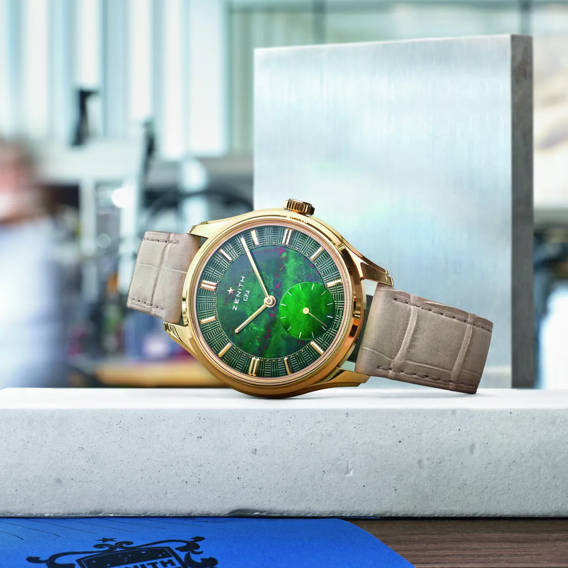 「G.F.J.」は、2025年のジュネーブウォッチグランプリで「クロノメトリー賞」を受賞したことで、その名声を高めました。ゼニスが積み上げた時間の専門性を体現するこの腕時計は、161本限定で新しいデザインが施されています。特に印象的なのは、ブラッドストーン文字盤とイエローゴールド製のケース。これにより、キャリバー135のストーリーがさらに豊かに表現されています。
