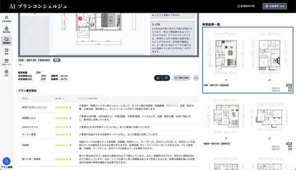 顧客が持つ土地の情報や要望、予算を担当者が入力し、AIが自動で2,000以上のプランから最適なものを選び出します。17項目に渡る条件から選択できるため、詳細な要望にも対応しやすく、お客様のイメージを即座に具現化できます。