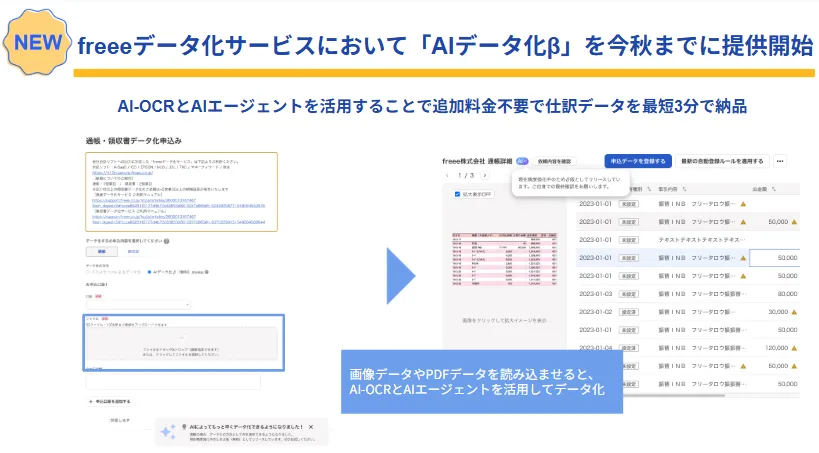 株式会社freeeは、本年秋までに会計・税理士事務所向けの記帳代行支援サービス「freeeデータ化サービス」に新機能「AIデータ化β」を導入することを発表しました。この新機能は、AI-OCR(光学文字認識)技術とAIエージェントを活用して従来の納品スピードを大幅に短縮し、最短3分での納品を可能にします。