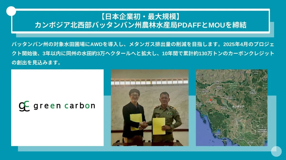 Green Carbon株式会社は、カンボジアのバッタンバン州において、初めて水田由来のカーボンクレジットを創出するプロジェクトを開始することが決まりました。これに伴い、バッタンバン州の農林水産局(PDAFF)とMOUを締結。プロジェクトの目的や意義について詳細を見ていきましょう。