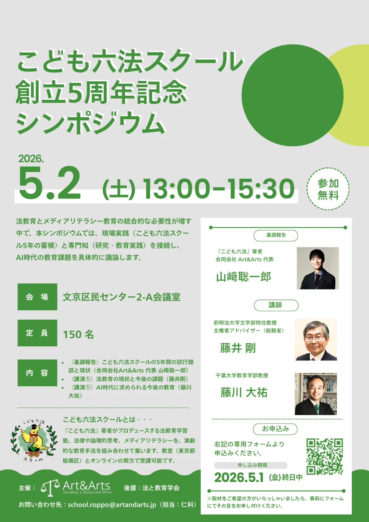 2026年5月2日、東京・文京区にて「こども六法スクール創立5周年記念シンポジウム」が開催されます。このシンポジウムでは、法教育とメディアリテラシー教育の重要性がテーマとなります。主宰は、ベストセラー『こども六法』の著者であり、法教育の第一人者である山﨑聡一郎氏です。