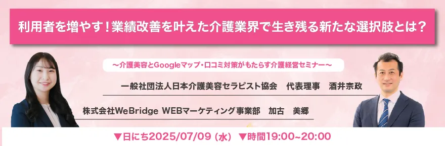 介護業界における競争が激化する今、利用者や入居者を増やすための新たな選択肢をためらっている経営者の方々も多いのではないでしょうか。そんな中、2025年7月9日19時より、介護業界向けの無料ウェビナーが開催されます。本ウェビナーでは、介護美容とMEO・口コミ対策に焦点を当て、具体的な集客方法を専門家から学ぶことができます。