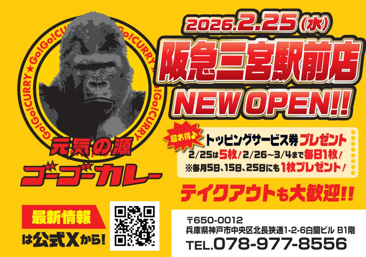株式会社ゴーゴーカレーグループが兵庫県内2店舗目となる「ゴーゴーカレー阪急三宮駅前店」を2026年2月25日(水)にオープンします。金沢カレーの魅力を多くの人に届けるために、姫路店に続いて三宮エリアへの出店を決定しました。三宮は、阪急・JR・阪神・地下鉄など複数の交通機関が乗り入れる、神戸のビジネスと観光の中心です。これにより、昼はビジネスパーソンや学生、夜は観光客が行き交うエリアで、手軽に美味しいカレーを楽しんでもらうことが狙いです。