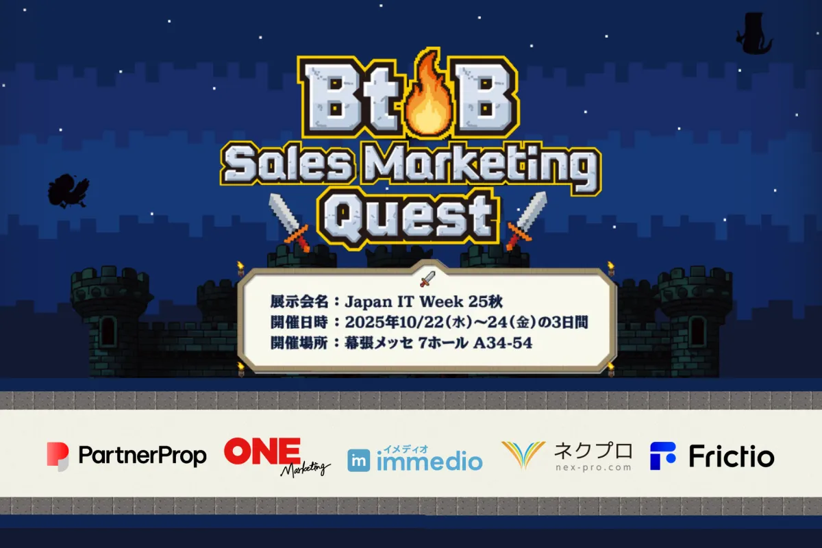 そのため、今回出展する5社は、協力し合いながら、各自の強みを生かしたソリューションを提示します。ワンマーケティングはマーケティング戦略の再構築をサポートし、パートナープロップはパートナーシップビジネスを戦略的に支援します。また、商談を自動化するimmedio、ウェビナー運営を効率化するネクプロ、AIを用いた商談支援を行うSYSLEAが揃い、新たな冒険の舞台を用意します。