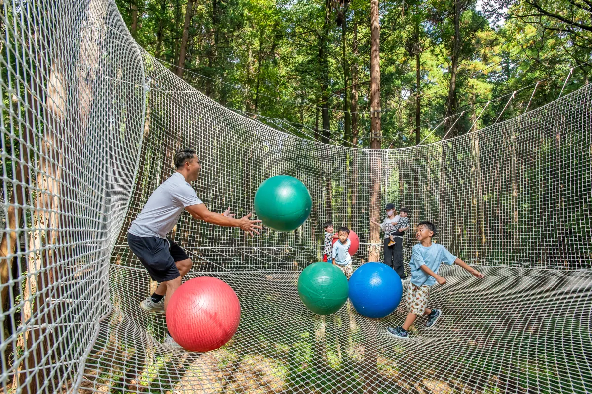 ネットコースは、従来のアクティビティとは異なり、安全装具(ハーネス)の装着が不要です。これにより、身長90cm以上の小さなお子様から大人まで、誰でも安心して楽しむことができるのが大きな特徴です。特に、ファミリーでの利用には最適であり、家族全員で一緒に体を動かすことで、楽しい思い出が作れます。