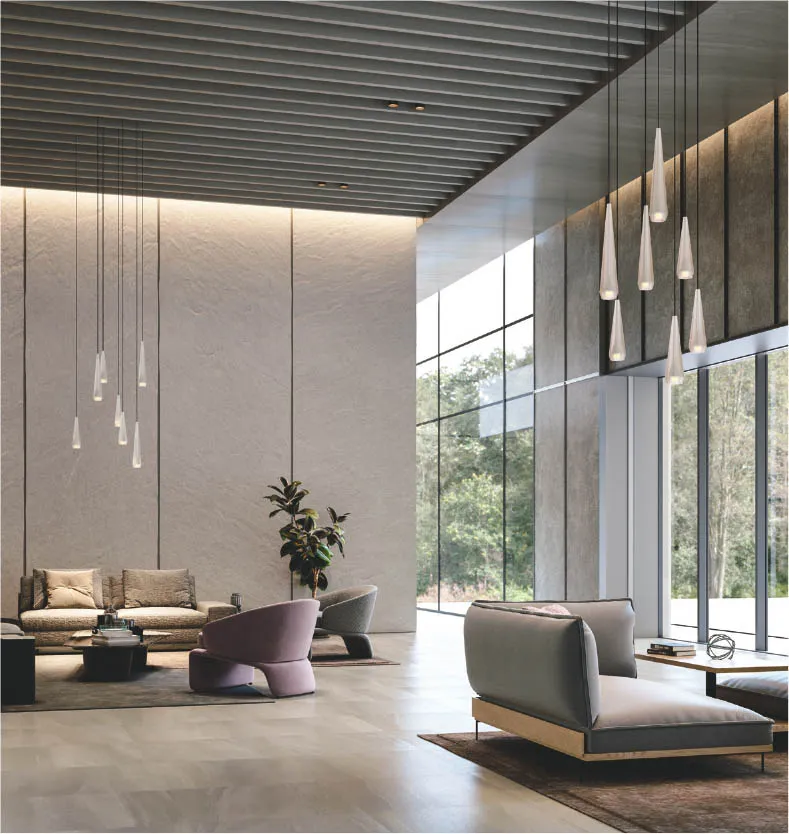 「Revea」シリーズのペンダントライトは、アクリル素材の特性を生かして、まるでガラスのように透明感のある美しさを提供します。無垢のアクリルを用いたセードは、控えめでありながら上質な光を演出し、昼間は自然光の中でも美しさを失いません。さまざまな空間に溶け込み、エレガントさを引き立てる形で、思わず目を引く存在に仕上げられているのです。