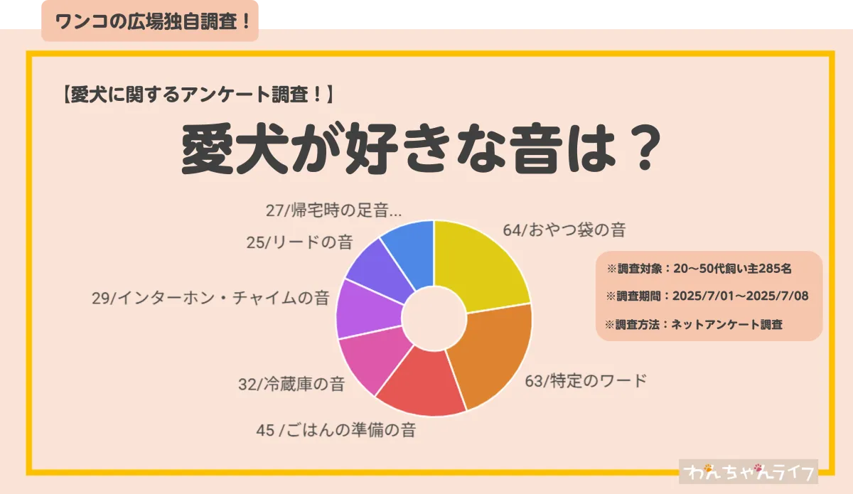 調査結果から、犬たちが最も好む音として「おやつ袋のカサッという音」が64票で1位に選ばれ、続いて「飼い主の声」や「散歩」などの特定のキーワードも高い票を得ました。また、ごはんを用意する際のお皿の音や冷蔵庫の開く音も票を集めており、これらは食への期待感を示す結果となりました。