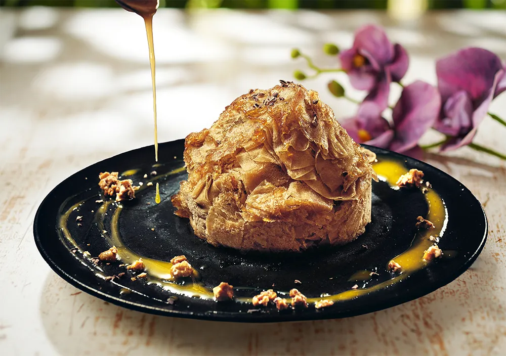 このかき氷の魅力は、贅沢なトッピングにもあります。キャラメリゼされたヘーゼルナッツが散りばめられており、トロピカルなマンゴーオレンジソースが加わることで、さらに味わい深い仕上がりになっています。また、世界中の文化人を魅了したさわやかなハーブ酒「アブサン」が加わり、甘さの中に深いコクが感じられるプレミアムな体験が楽しめます。