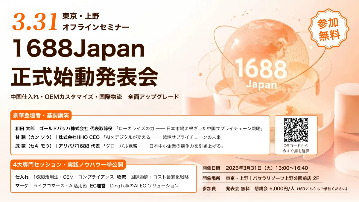 2026年4月1日より、中国最大のBtoB卸売プラットフォーム「1688.com」の日本市場における唯一の公式総代理管理サービス「1688Japan」がスタートします。この新たな「1688Japan」の設立を記念して、3月31日には東京・上野で「日中クロスボーダー仕入れ新トレンドセミナー」が開催されることが発表されました。