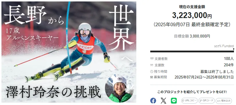 17歳のアルペンスキーヤー、澤村玲奈選手がクラウドファンディングプロジェクト「長野から世界へ17歳アルペンスキーヤー澤村玲奈の挑戦!」を成功裏に終え、目標の300万円を超える支援金を集めました。支援金は最終的に3,223,000円に達し、海外での遠征費用に充てられる予定です。