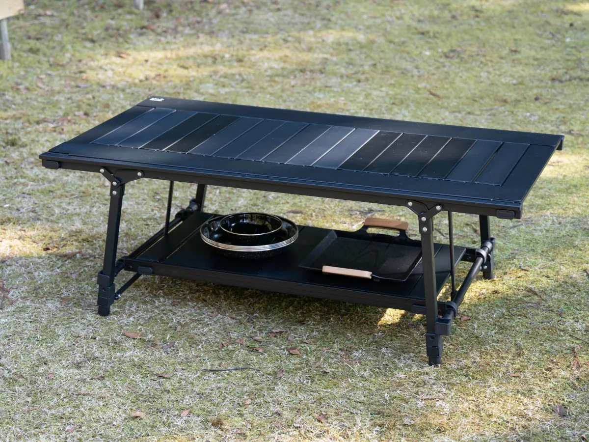 「アルミユニットテーブル」は、その名の通り、アルミ製のユニークなテーブルで、これまでに6万台以上の販売を記録しています。自由にカスタマイズできる設計は、ソロキャンプから家族キャンプまで多くのスタイルをサポートします。ラインナップは、「88」と「110」の2つのサイズがあり、天板を取り外してバーナーやコンロを設置することができるのも大きな魅力です。