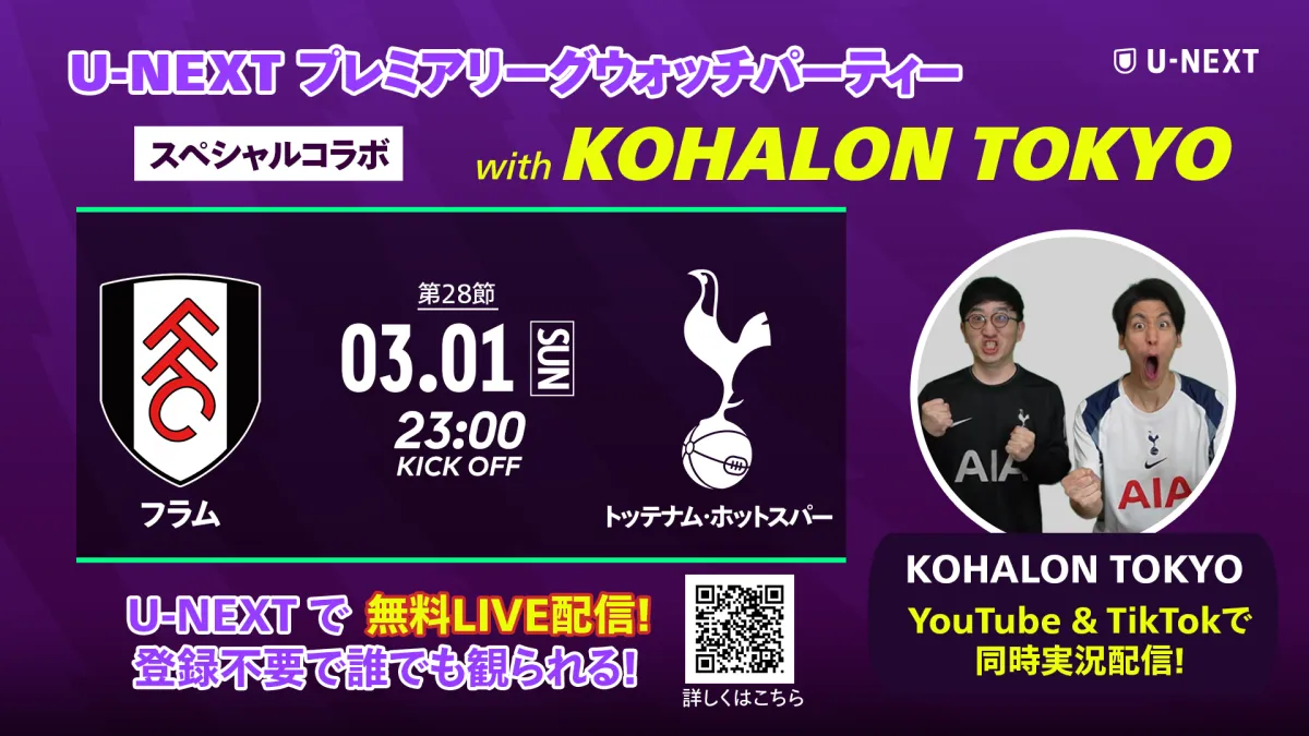 2026年3月1日(日)、動画配信サービス「U-NEXT」が、人気クリエイター「KOHALON TOKYO」と協力してプレミアリーグのウォッチパーティーを行うことが発表されました。このイベントは、世界的に人気のあるプレミアリーグの試合『フラム vs トッテナム・ホットスパー』に合わせて開催され、特にサッカーファンにとって見逃せない機会となっています。