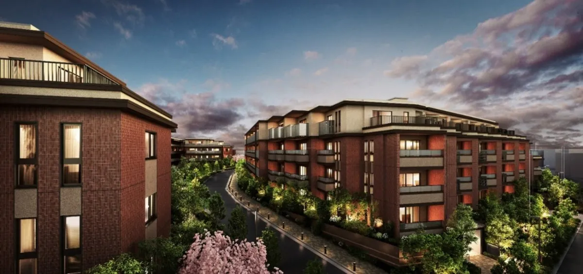 このマンションは248戸という大規模な低層住宅で、周囲の環境との調和を重視した設計がされています。外観は温かみのあるレンガ調のタイルが使われ、プレーリースタイルの建築意匠が自然と融合しています。自然環境を意識することで、美しい都市景観に貢献するように考慮されています。また、敷地内には「中庭」が配置されており、住民の憩いの場として活用される予定です。