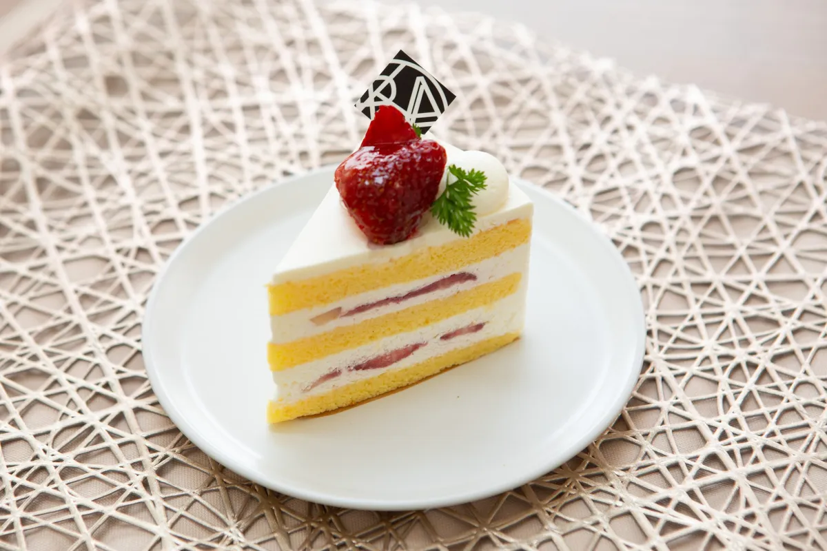 このショートケーキの魅力は、なんといっても二層になったクリームの中に惜しみなくサンドされた苺です。トッピングには「産地直送」のあまおう苺など、その時季に最も美味しい苺を使用しています。この旬のフルーツの風味が生クリームと絶妙に絡み合い、心地よい甘さを引き出します。