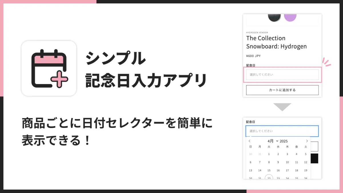 このアプリは、各商品ページにて日付セレクターを設けることができ、顧客が希望する日付を直感的に指定できます。特に記念日や刻印希望日など、重要な日を顧客が簡単に入力できるため、ユーザーエクスペリエンスの向上に寄与します。