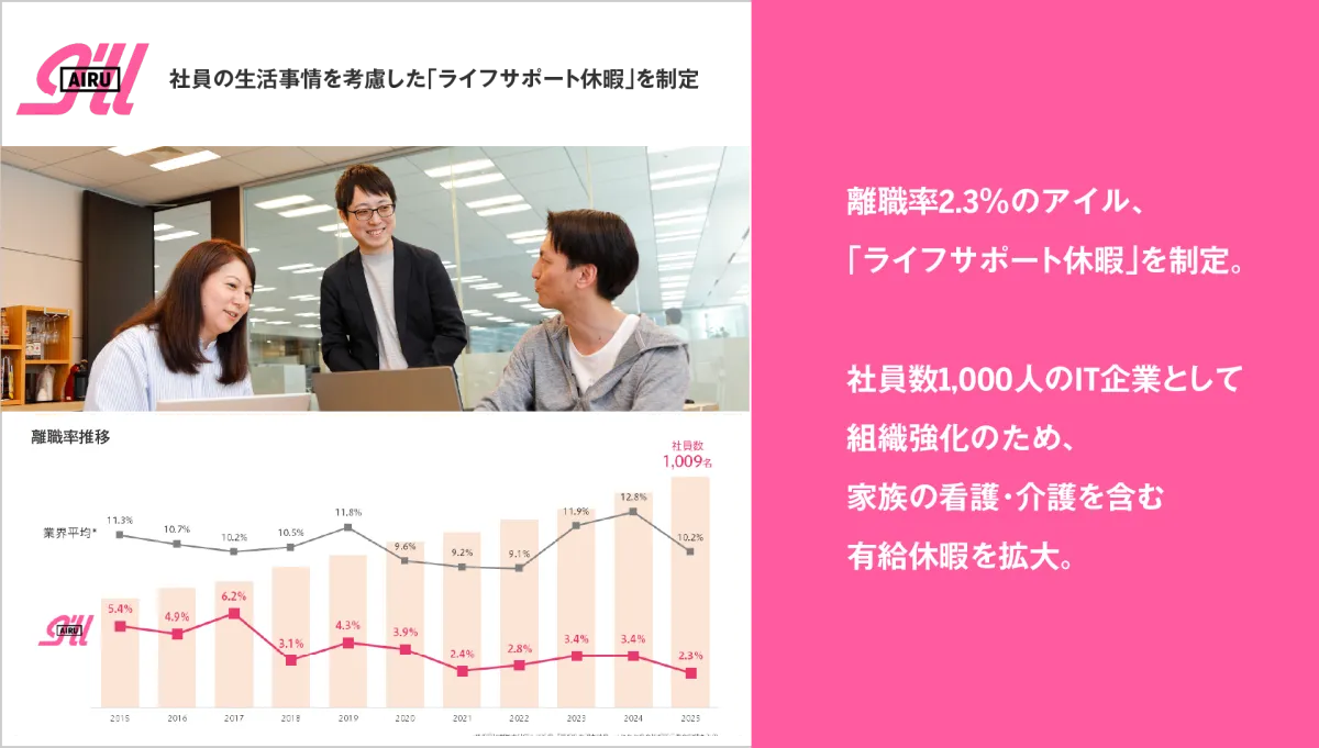 アイルは2021年から、生理による休暇を有給で取得できる制度を導入しており、その取得率は約22%に上ります。この積極的な取り組みが評価され、社員からも高い評価を得ていることが、「ライフサポート休暇」の導入を後押ししました。
