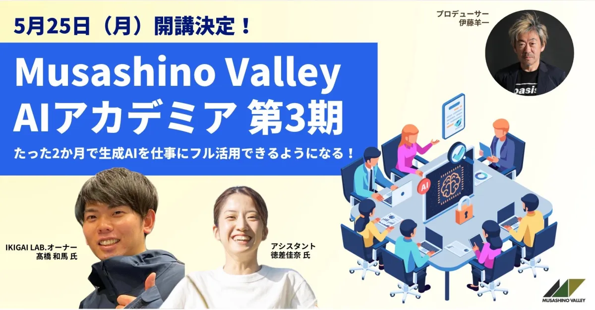 「次のステップ」をサポートするスタートアップスタジオ、Musashino Valleyが、2026年5月25日から「AIアカデミア第3期」を開催します。この講座では、生成AIを活用しながら、実務に直結したスキルを習得することを目指します。